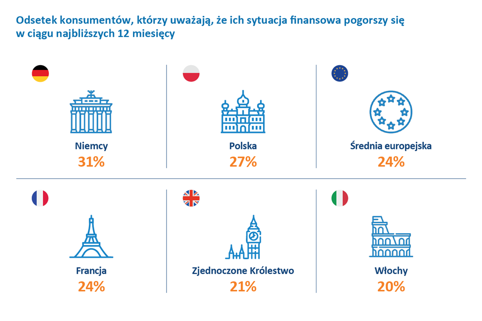 Choć inflacja dotyka całą Europę, jej skutki są różne w zależności od kraju. Niemcy częściej spodziewają się pogorszenia sytuacji finansowej niż mieszkańcy Włoch czy Wielkiej Brytanii. W efekcie wielu konsumentów ogranicza oszczędności – zarówno codzienne, jak i te na sytuacje awaryjne. W Niemczech aż 29% osób oszczędza mniej na nieprzewidziane wydatki.